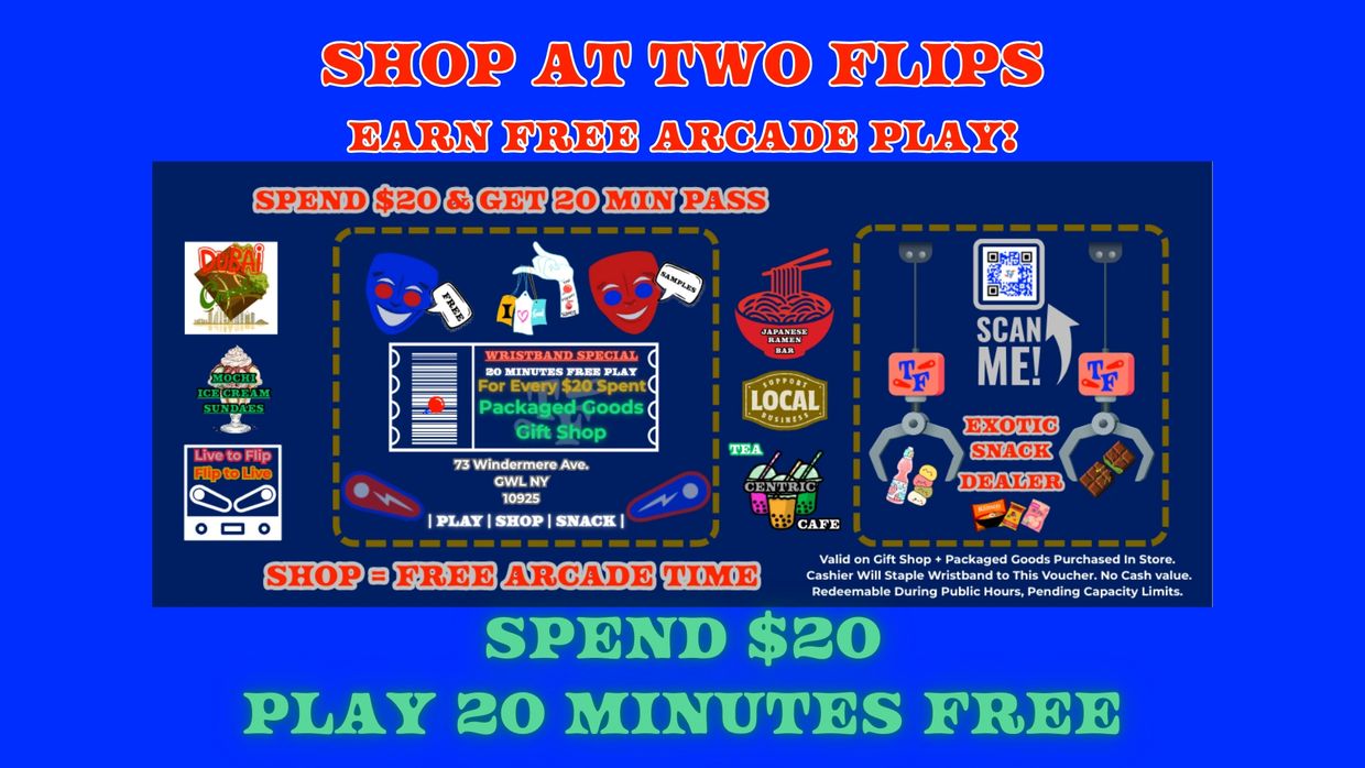 At Two Flips Pinball & Gifts, our hand-picked selection spans 5 decades of gaming history. We offer an incredible arcade experience with pinball machines, video arcade games & play till you win Claw Machines.